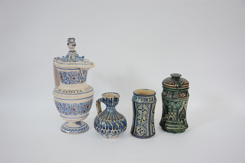 Lotto composto da due albarelli e due versatoi di diversa fattura ed epoca (difetti)