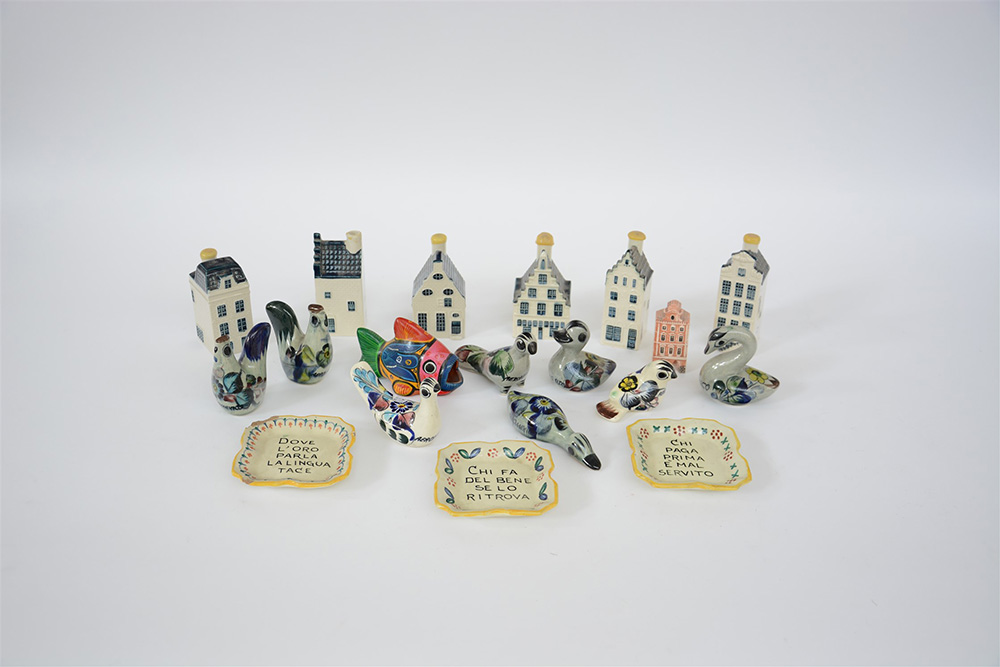 Lotto composto da alcuni oggetti raffiguranti case, rovine e animali in...