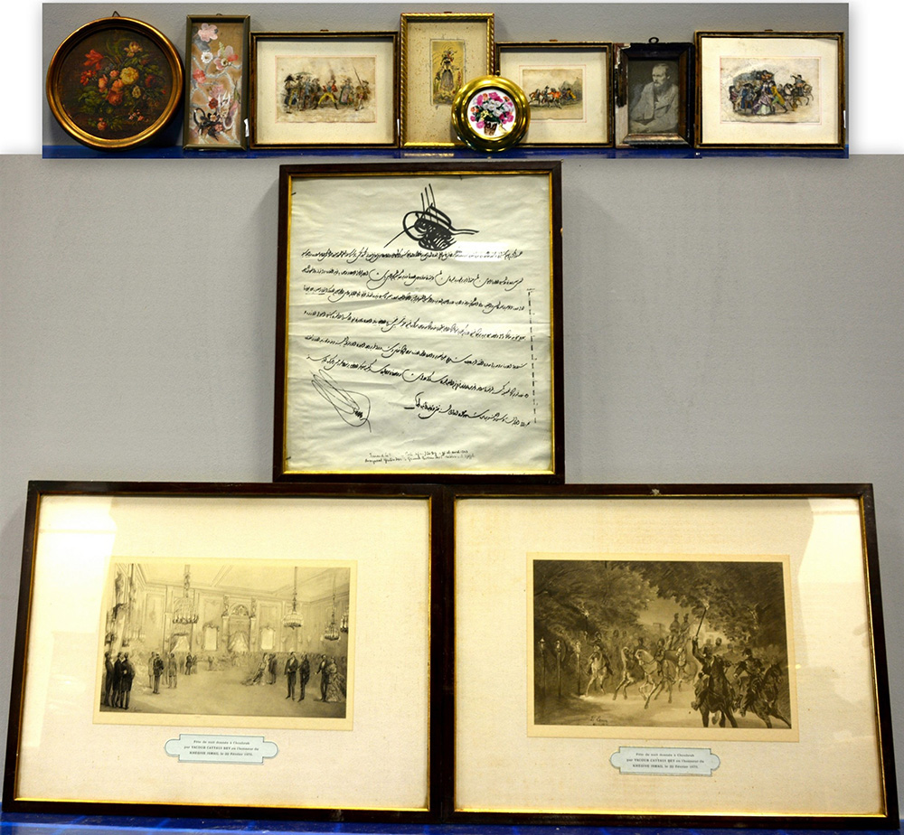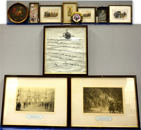 Lotto composto da undici cornici contenenti riproduzioni, disegni, piccoli...