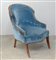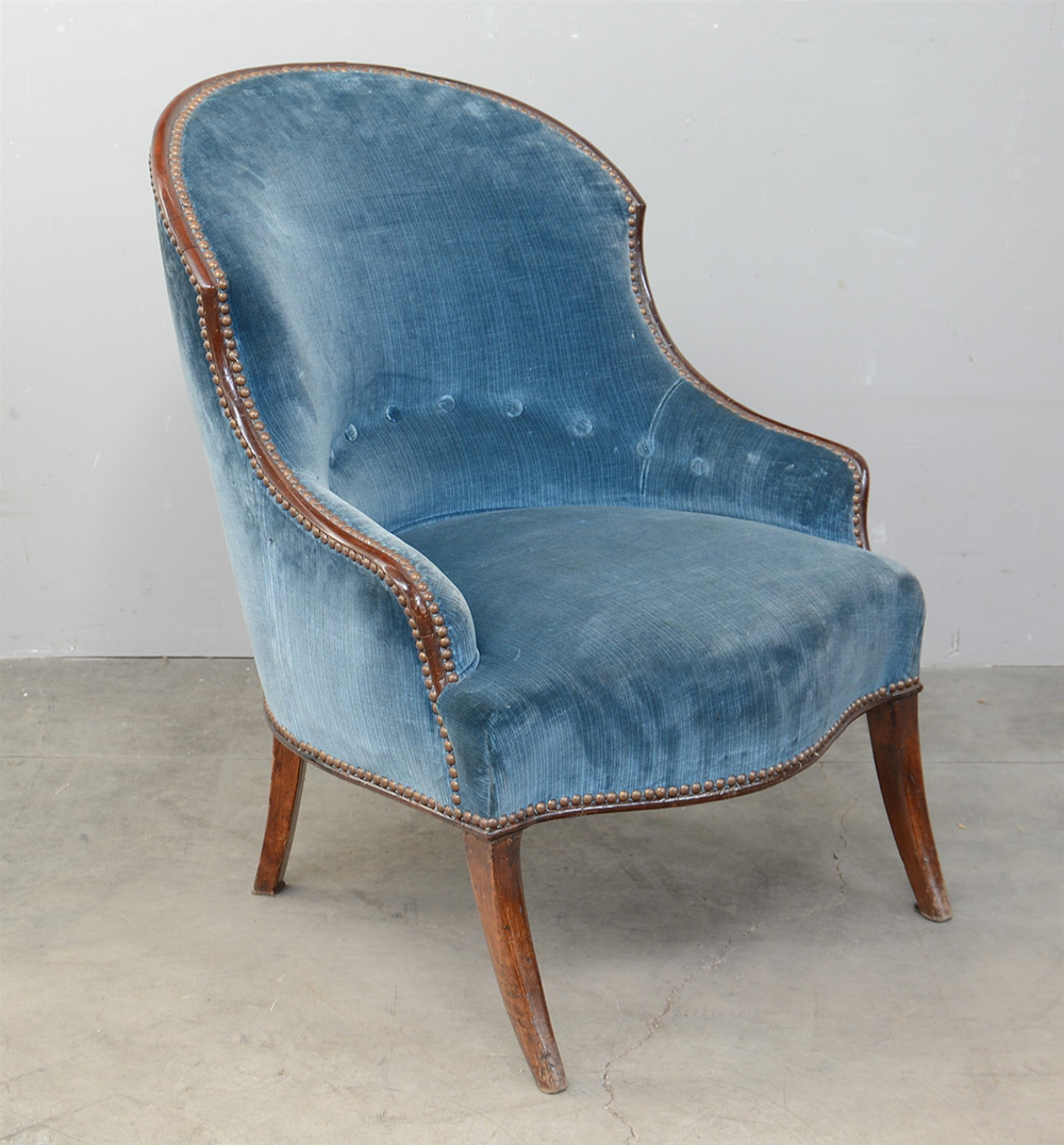 Poltroncina con schienale e montanti sagomati, gambe mosse. Ricoperta in tessuto azzurro. Fine sec. XIX