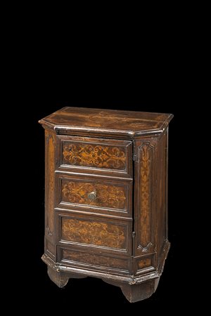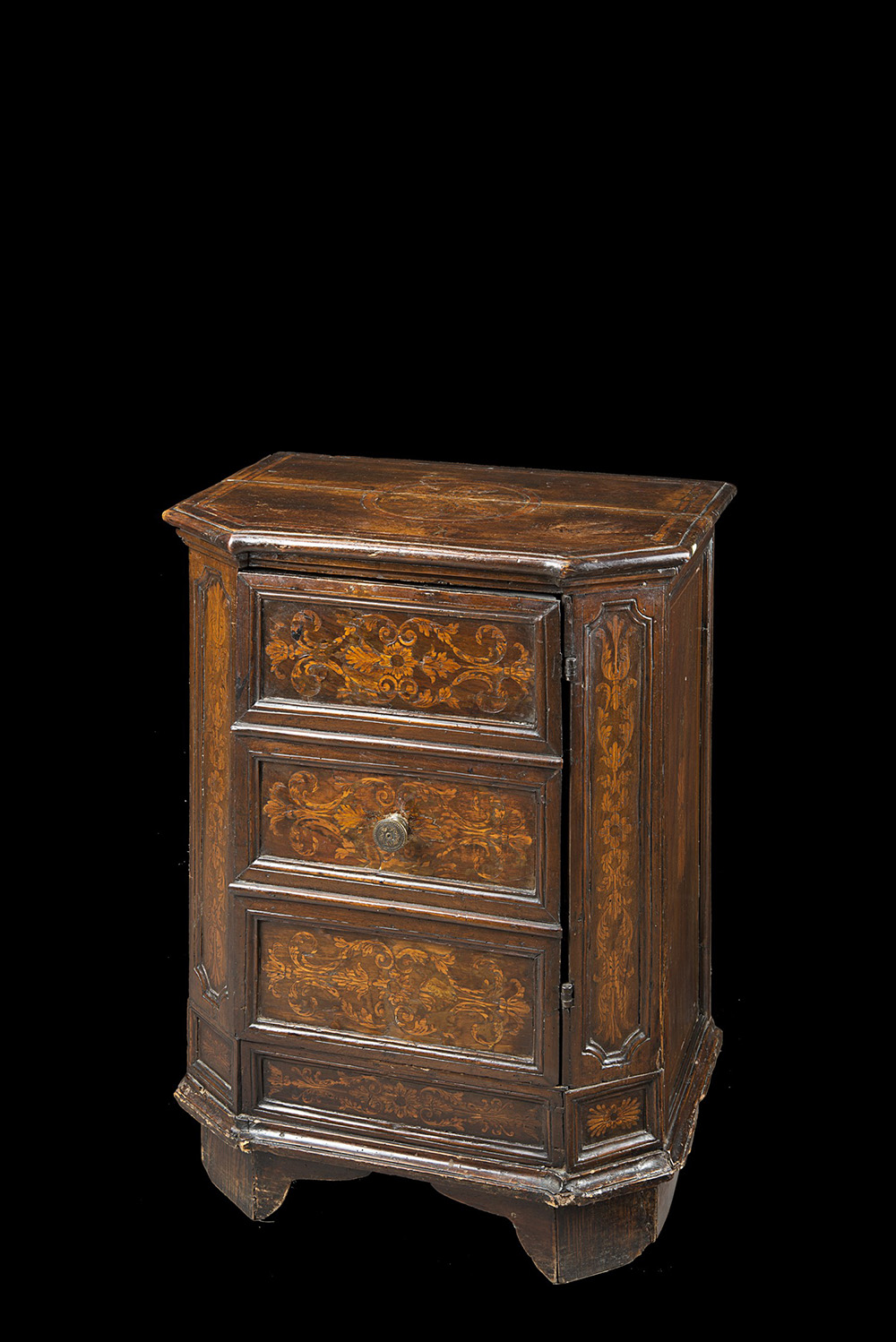 Comodino ad un'anta con fronte a tre finti cassetti. Piano, fianchi e montanti intarsiati in legno chiaro a volute e fiori. Piedi a mensola. Sec. XVIII (difetti e restauri)(inginocchiatoio trasformato)