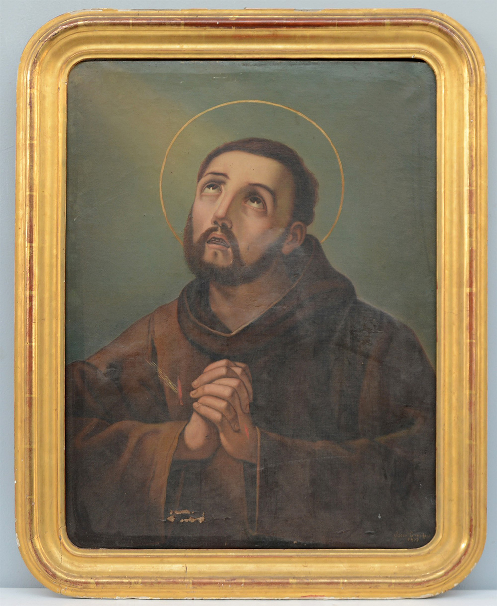 Bossi E. "Santo" olio su tela (cm 70x52) firmato e datato 1877 in basso a destra e iscritto sul telaio al retro in cornice (difetti)