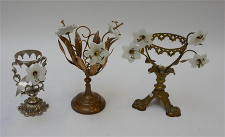 Lotto composto da tre basi in metallo decorate con fiori in vetro (difetti)