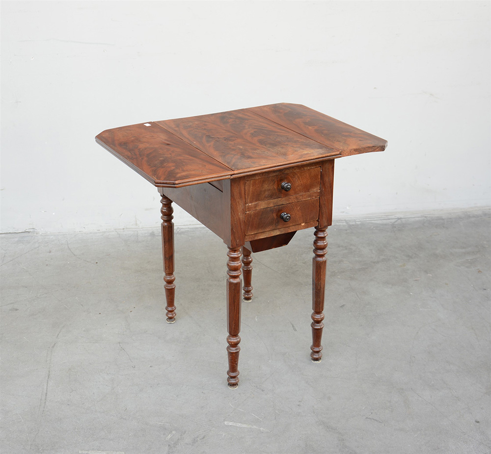 Tavolo da lavoro ad alette in noce ad un cassetto sottopiano con gambe sfaccettate. Sec. XIX (cm 63x65x37) (difetti e mancanze)