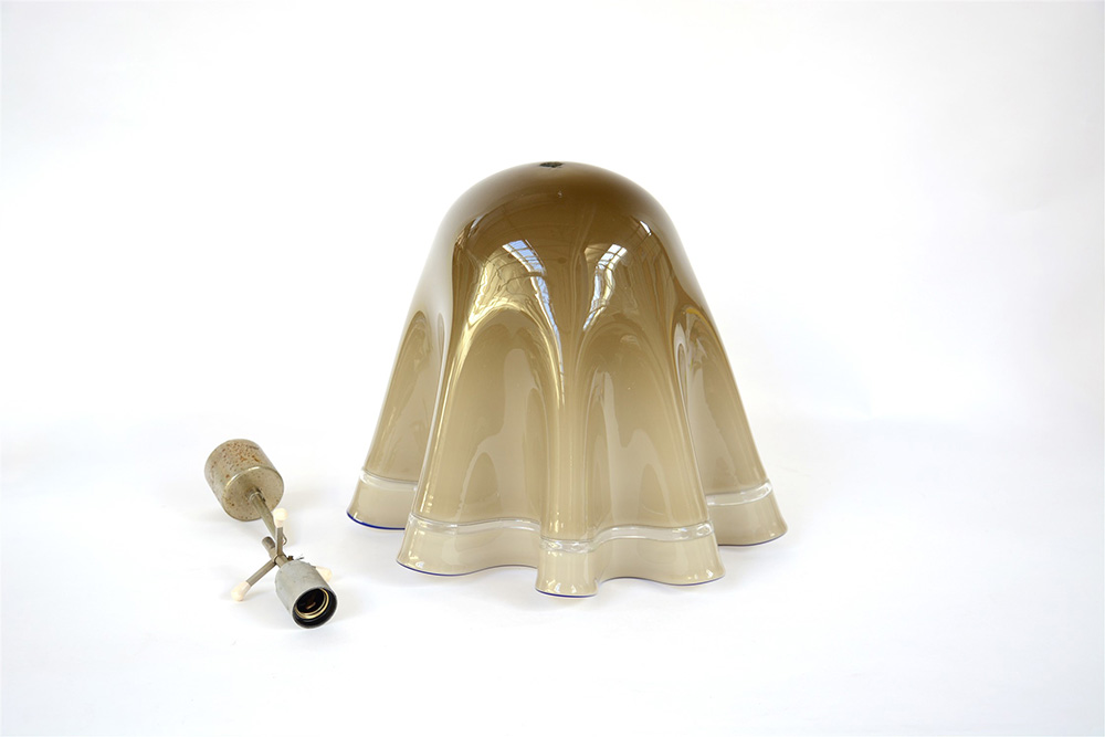 Manifattura di Murano. Lampada a sospensione con diffusore in vetro soffiato incamiciato a fazzoletto di colore tortora, trasparente e blu. Produzione recente (lievi difetti)