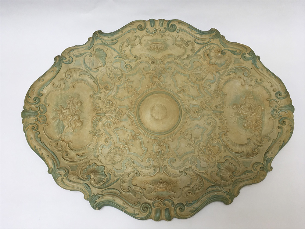 Arte del sec. XIX. Grande vassoio in gesso decorato in policromia a rilievo a putti e corone (cm 72x55) (lievi difetti)