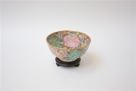 Ciotola in porcellana policroma con decorazione "millefleurs" su fondo dorato base in legno Cina, sec. XX (d. 20 cm.)