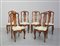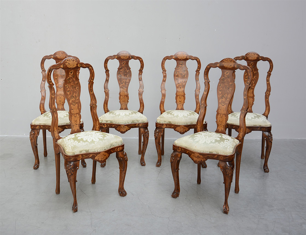 Gruppo di sei sedie con schienale traforato e intarsiato in legni vari a fiori e vasi. Gambe mosse intagliate all'attacco. Olanda, fine sec. XIX (restauri)