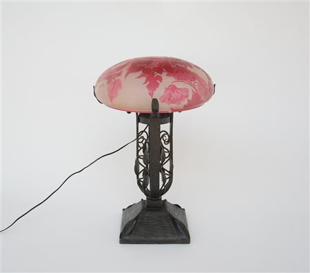 Lampada con struttura in ferro battuto e diffusore in vetro a cammeo inciso all’acido nei toni vinaccia e ghiaccio. Sec XX. Firma "Gallé" (d cm 29, h cm 45) (lievi difetti al diffusore)