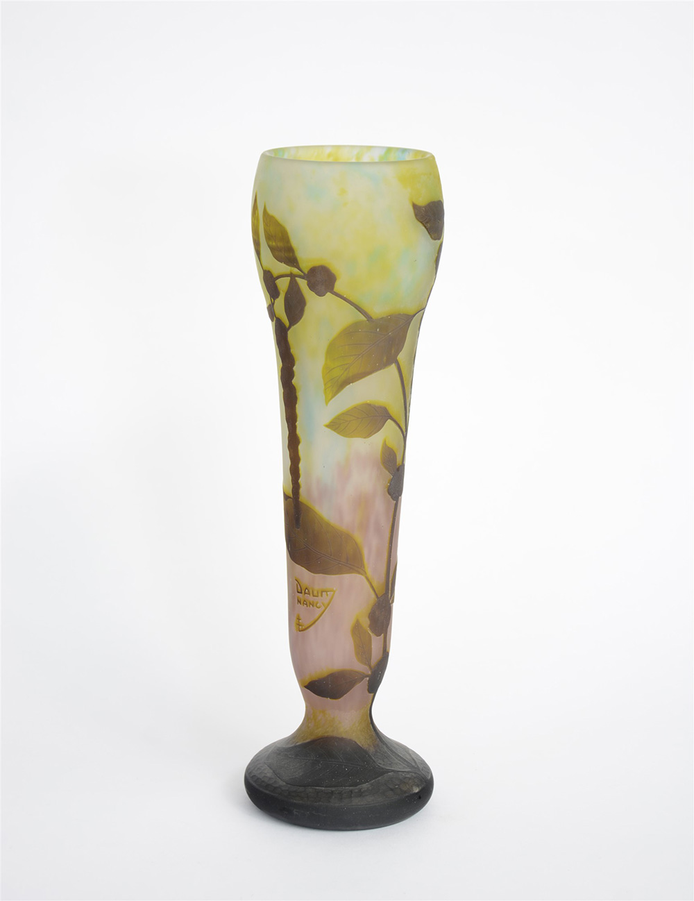 Daum, Nancy Vaso in vetro a cammeo inciso nell'acido con decori vegetali nei toni ghiaccio, verde, bruno e ametista. Inizi Sec XX. Firmato a cammeo (h cm 39) (lievi difetti e imperfezioni)