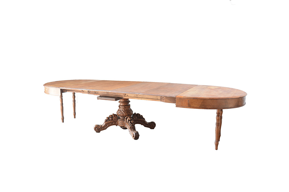 Tavolo ovale allungabile in noce con gamba centrale tornita e intagliata a motivi vegetali terminante a quattro piedi sagomati e scolpiti a motivi di frutta, foglie e fiori. Sec. XIX (cm 160x80x126)(munito di prolunghe)