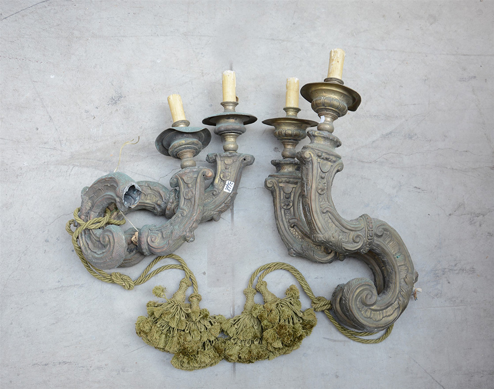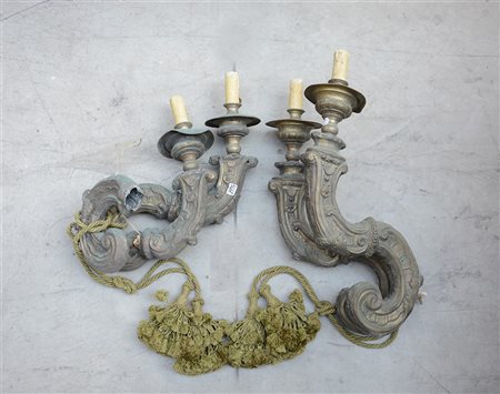 Coppia di appliques a due luci in rame sbalzato e dorato sec XIX (cm h 41) (difetti e restauri)