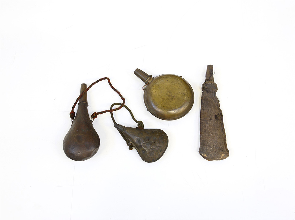 Lotto composto da due fiasche da polvere in metallo, unito ad un polverino ed un portapallini in pelle (l max 19 cm) (difetti e mancanze)