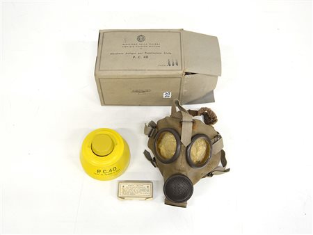 Maschera antigas per popolazione civile del 1940 (modello PC 40) completa di filtro, istruzioni e sapone antiappannante, in custodia di cartone originale (difetti)
