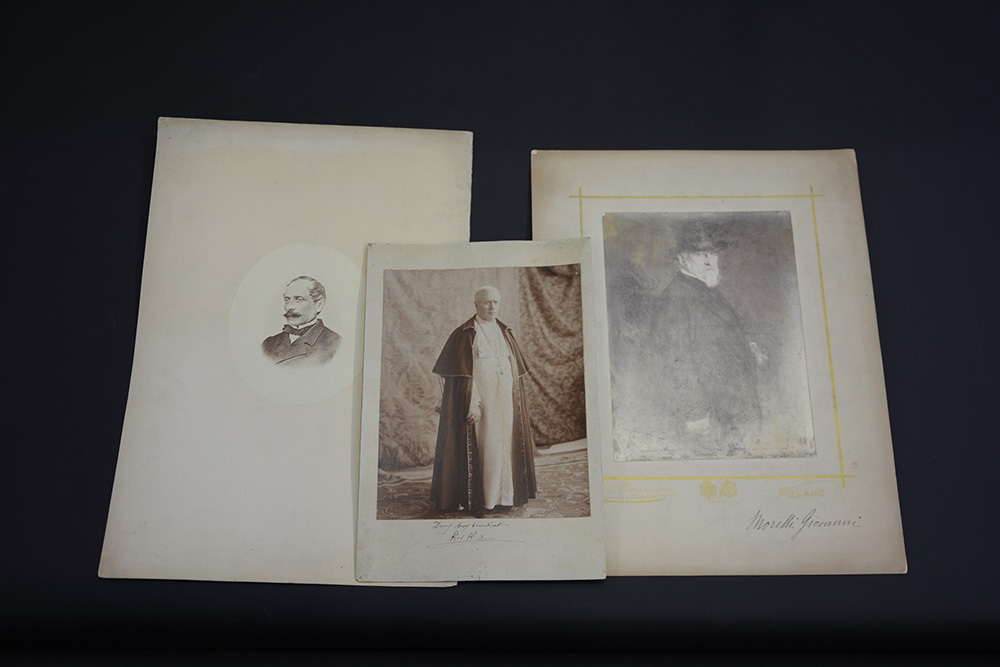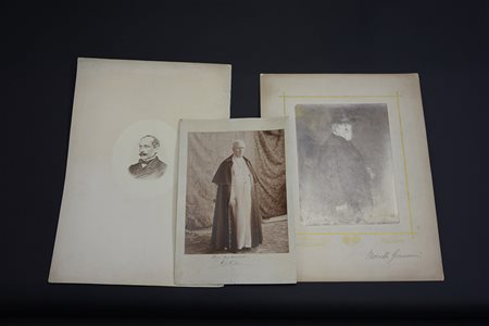 Lotto di tre grandi fotografie tra cui un ritratto di Papa Pio X, inizio sec. XX (max cm 46x35)(difetti)