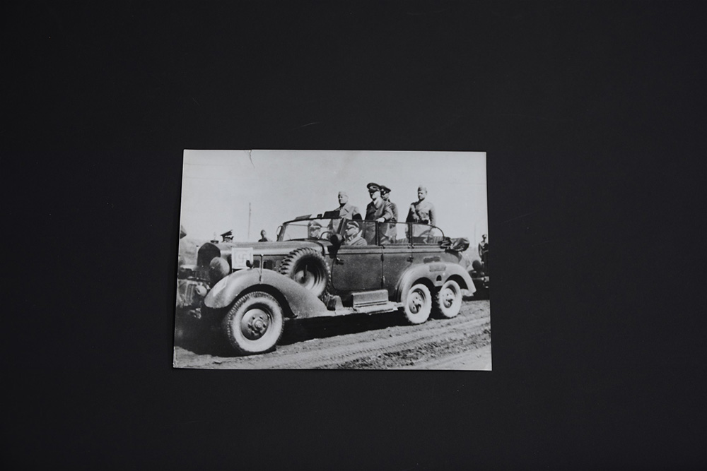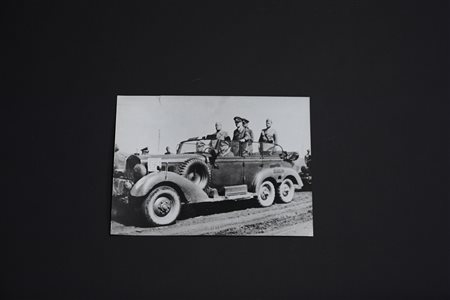 Fotografia in bianco e nero raffigurante Adolf Hitler e Benito Mussolini su un automezzo militare durante una visita alle truppe al fronte, anni '40 (cm 24x19)(difetti)