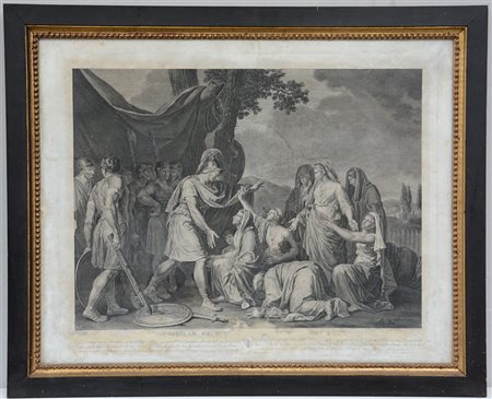Acquaforte della fine del sec. XVIII raffigurante una scena classica (cm 65x80) In cornice in legno ebanizzato con profilo interno perlinato (gravi difetti e restauri)