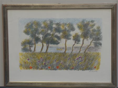Michele Cascella. "Paesaggio mediterraneo" Litografia prova d'artista a colori (cm 50x70) firmata in basso a destra, in cornice
