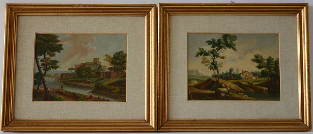 Firma indecifrata "Paesaggi fluviali con figure" coppia di olii su cartone...