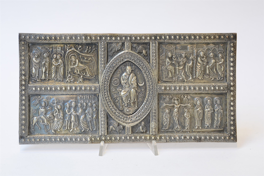 Modello di paliotto in argento con bassorilievi di gusto romanico raffiguranti episodi della vita del Cristo (gr 680 ca.) (cm 29.5x15)