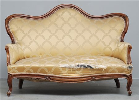 Divano a tre posti in noce con schienale mosso, montanti, gambe e fascia sagomate. Fine sec. XIX, inizio sec. XX (difetti)