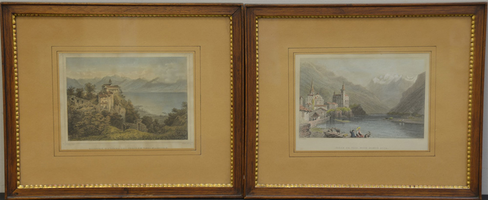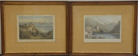 Coppia di litografie a colori raffiguranti scorci del lago Maggiore (cm...