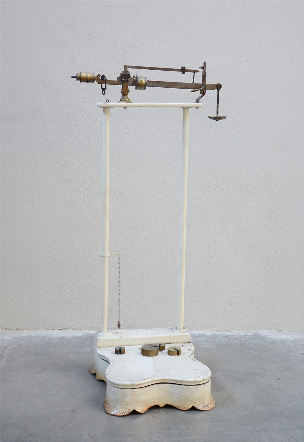 Bilancia pesa persone in metallo laccato bianco e ottone (difetti)