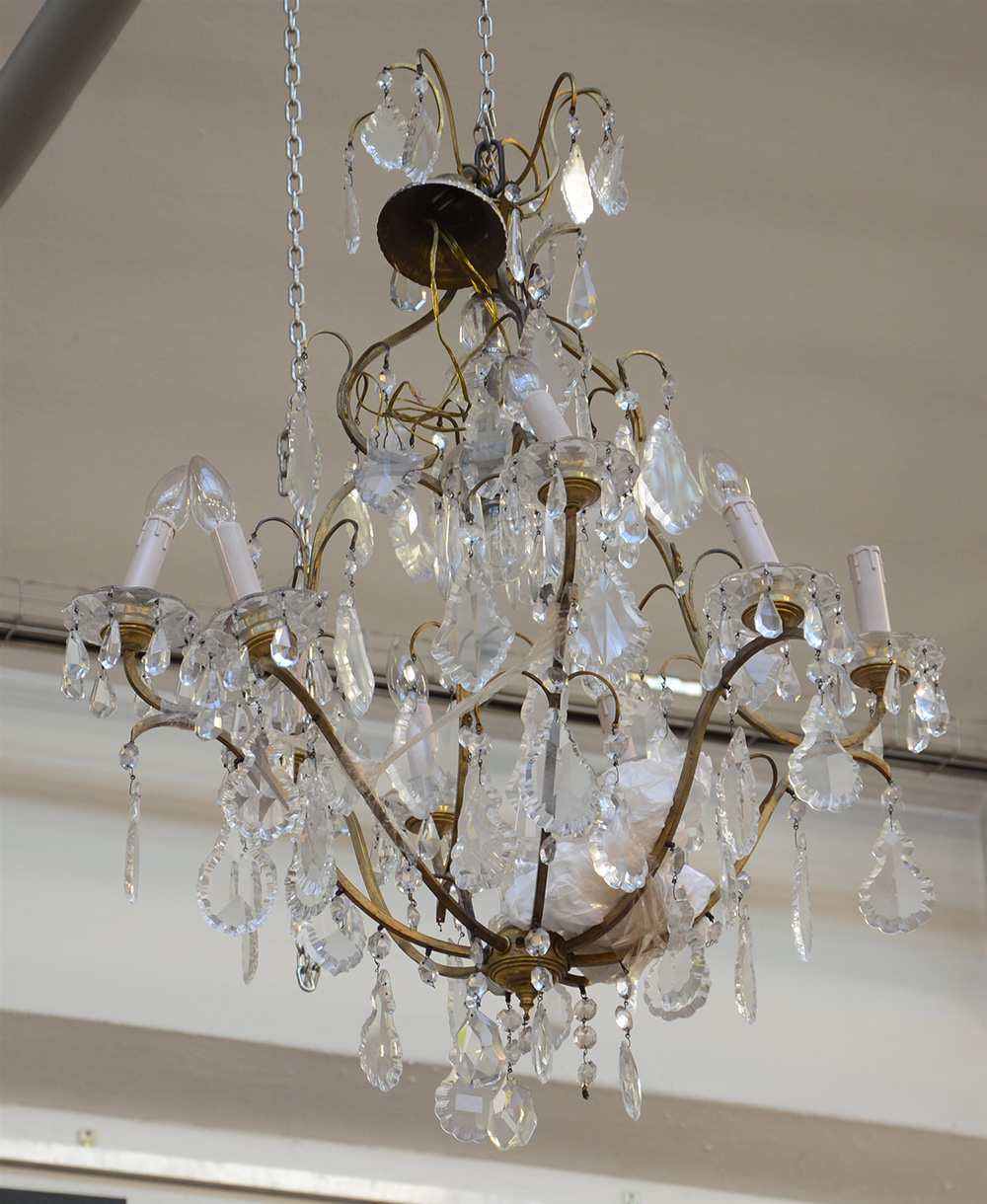 Lampadario a sette bracci e otto luci con struttura in metallo dorato curvato. Pendagli a sagoma in vetro (difetti e mancanze)