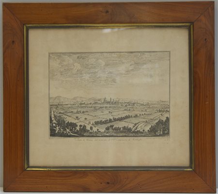 Incisione in rame del sec. XVIII raffigurante una veduta di Firenze dal convento dei Padri Cappuccini di Montughi (cm 34x39) in cornice