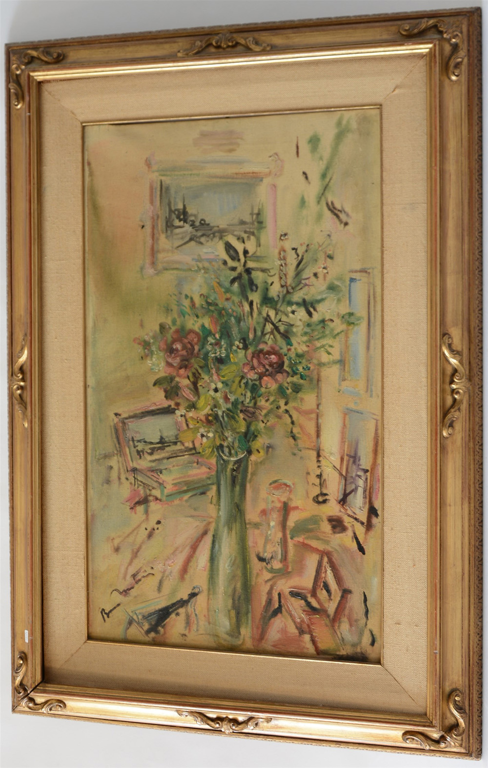 Firma indecifrata "Interno di casa con vaso di fiori" olio su tela (cm 70x40) Firmato in basso a sinistra, in cornice