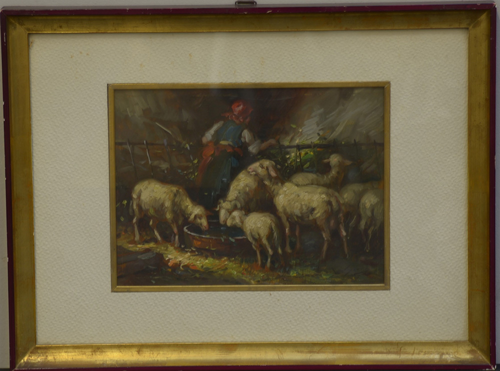 Firma indecifrata "Pecore all'abbeverata" olio su cartoncino (cm 17x23) firamto in basso a destra, in cornice