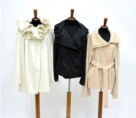 KRIZIA, KRIZIA TOP e CAPO CAMPIONE Lotto composto da tre giacche. Il campione di ispirazione per gli altri in misto cashmere color cipria unito ad una giacca in lana con collo a ruches color bianco e un giacchino in tessuto tecnico goffrato con collo sciallato (taglie varie) (lievi difetti) -EN KRIZIA, KRIZIA TOP and SAMPLE GARMENT Lot comprising three jackets. The white jacket with a ruche collar, the embossd fabric jacket with shawl collar (different sizes) (minor defects)