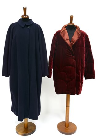 KRIZIA Lotto composto da un cappotto lungo in lana e cashmere blu e un giaccone in velluto imbottito e trapuntato color rubino (tg 44 e 46) (lievi difetti) -EN KRIZIA lot comprising a long wool and cashmere blue overcoat and a ruby colour padded matelassé velvet coat (sizes 44, 46) (minor defects)