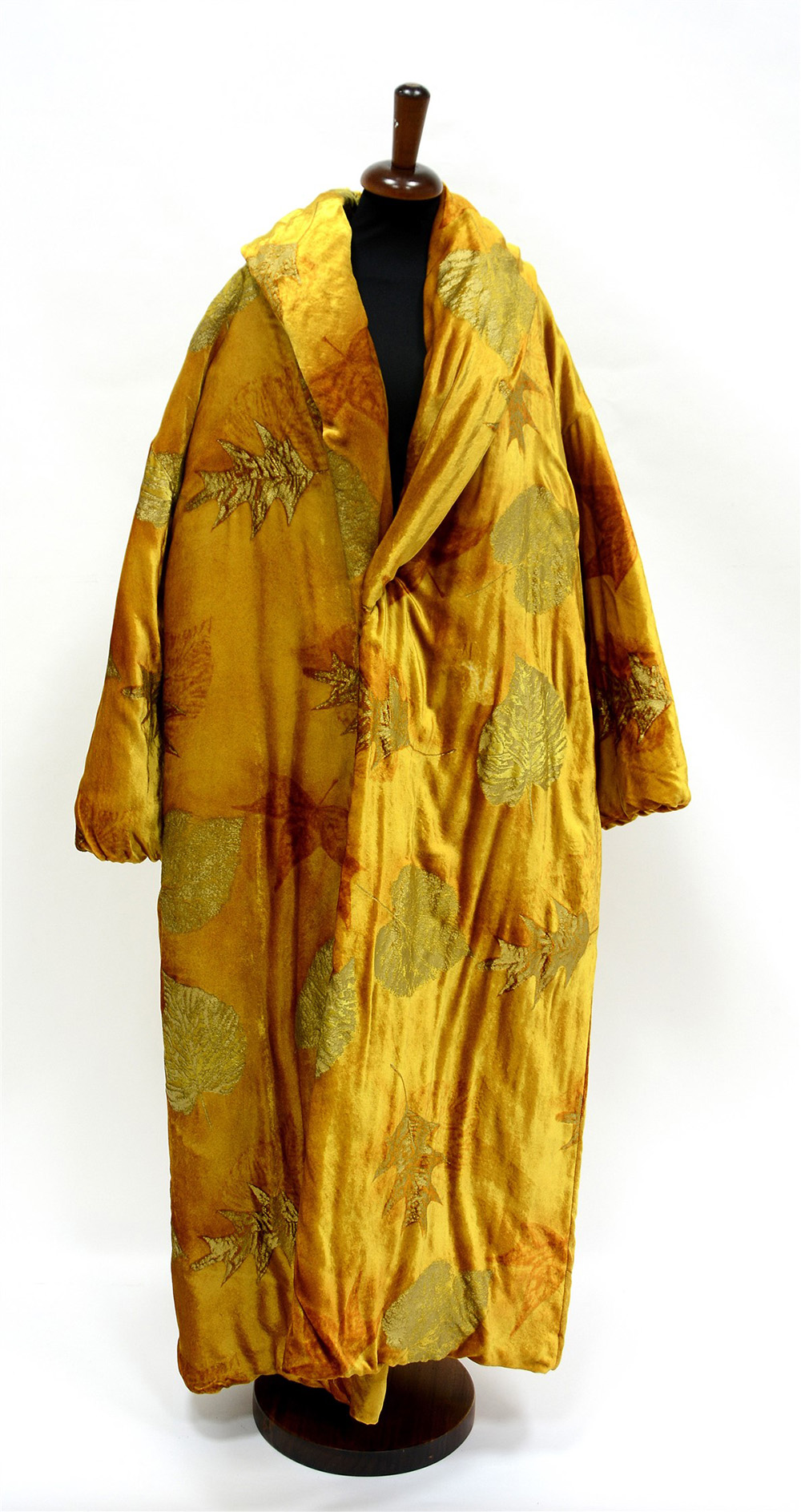 KRIZIA Cappotto imbottito lungo, in velluto color giallo cangiante arancione con motivo di foglie autunnali color oro, collo sciallato (tg 42) -EN KRIZIA Long yellow velvet coat with leaf pattern (size 42)
