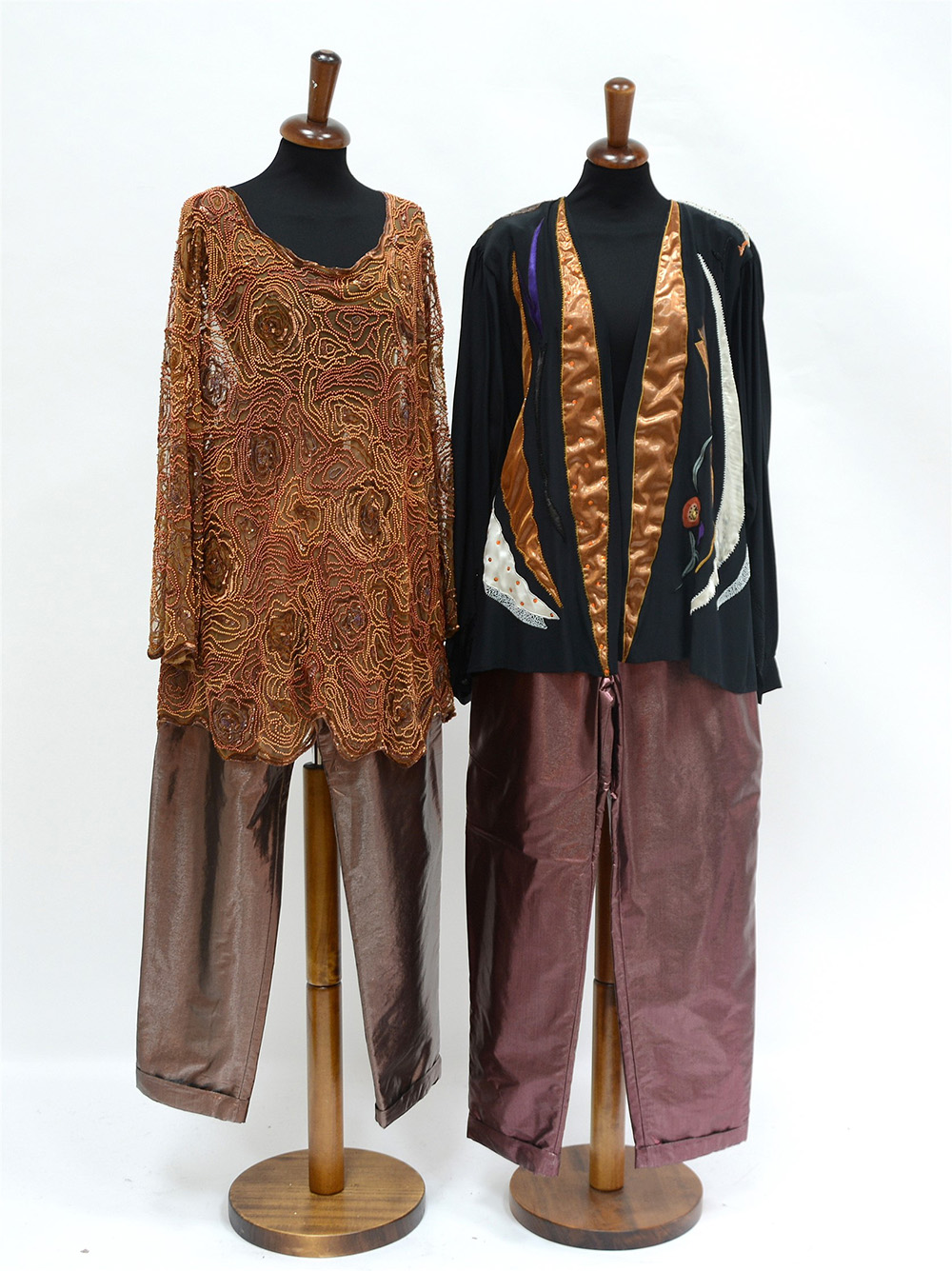 KRIZIA Lotto di due camicie e due paia di pantaloni in seta e cotone con ricami in rilievo sui toni della terra bruciata, nero e multicolor (taglie varie) -EN KRIZIA Lot comprising two shirts and two pairs of pants in silk and cotton with relief embroidery in the shades of sand, black and multicolour (various sizes)