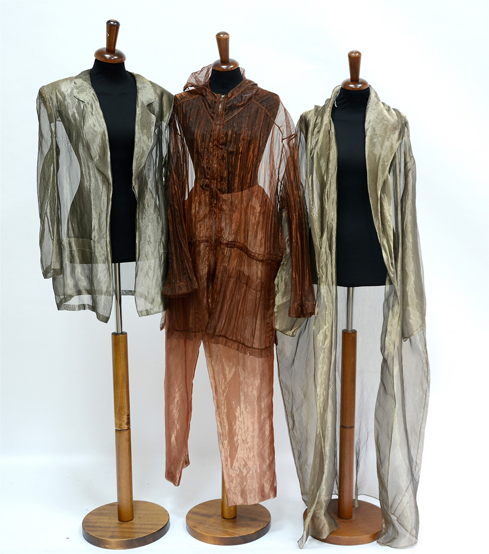 CAPI CAMPIONE Lotto di due capispalla e un completo in garza di seta e misto seta nei toni del mordoré. Fogge e taglie differenti (difetti) -EN SAMPLE GARMENTS Lot comprising three coats and a suit in silk gauze and silk blend in shades of bronze. Different sizes and styles
