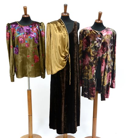 KRIZIA e KRIZIA POI Lotto composto da abito a canottiera, casacca, maglia e top in tessuto di velluto di vari colori (tg. 42/44) -EN KRIZIA and KRIZIA POI Lot comprising a chemise dress, a jacket and knit top in various materials and colours (sizes 42/44)
