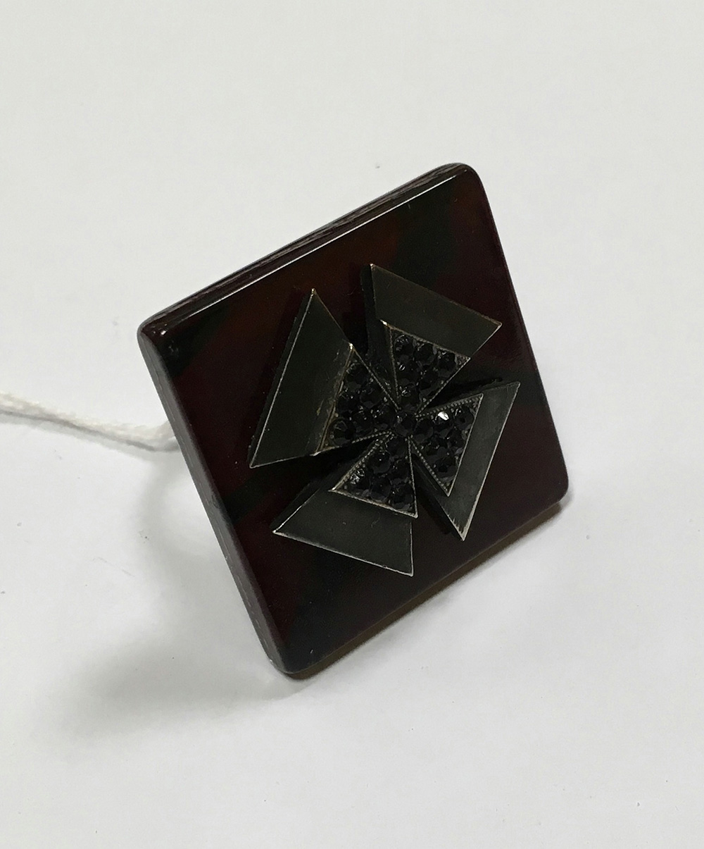 PAOLO BELLINI Anello di forma quadrata in galalite color tartaruga, metallo e piccoli strass centrato da motivo a croce