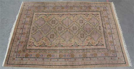 [Tappeti] Tappeto Samarkanda, sec. XX. Disegno geometrico con Gul uncinati nei toni del verde chiaro, rosa, azzurro e nero (cm 366x265) (difetti)