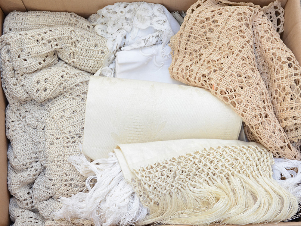 Cartone contenente numerose tovaglie e tovagliette (difetti)