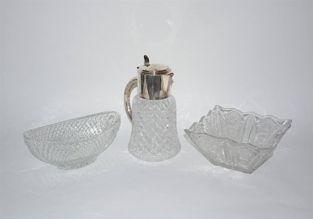 Lotto composto da due centrotavola in cristallo molato ed una brocca con presa e coperchio in metallo argentato (difetti)