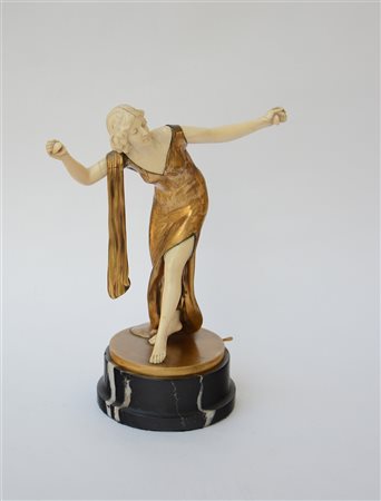 Blacz "Ballerina con nacchere" Scultura in bornzo dorato e avorio (h cm 29)Firmata alla base. Poggiante su base tonda in marmo nero (difetti)