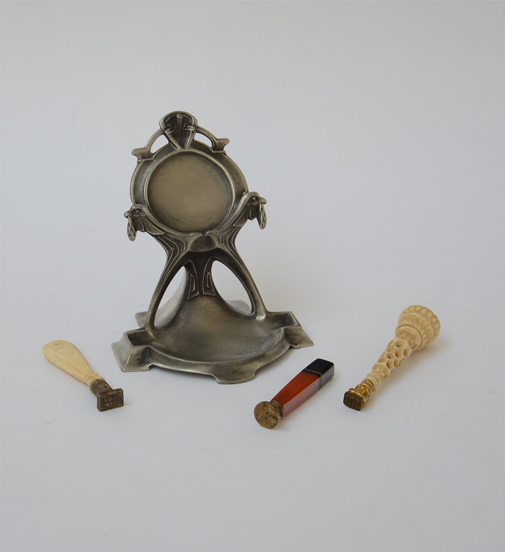 Lotto composto da un porta orologio liberty in peltro e tre sigilli in osso,...