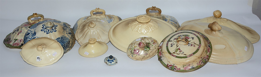Lotto composto da tredici coperchi in maiolica e porcellana di epoche, manifatture e decori diversi (difetti e mancanze)