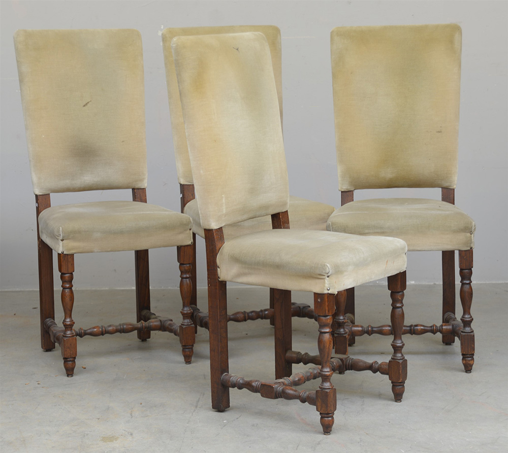 Gruppo di quattro antiche sedie a rocchetto rivestite in velluto (difetti)