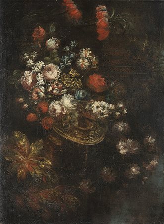 Maestro del secolo XVII "Composizione con fiori e piatto" olio su tela (cm...