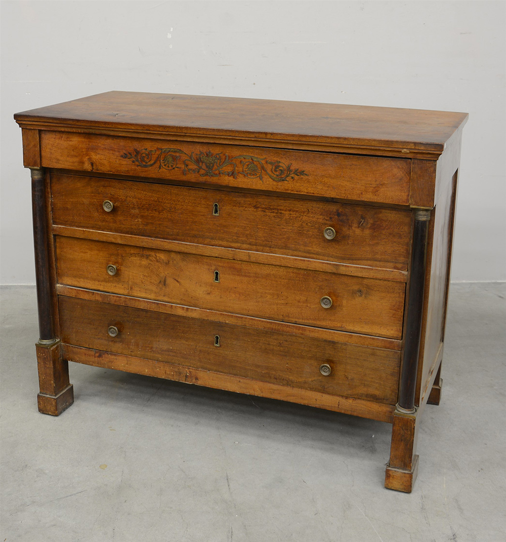 Como' in noce a tre cassetti e mezzo, montanti a colonna tornita, piedi a pilastro, sec XIX (cm 121x95x58)(difetti)