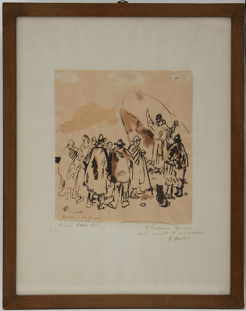 Felice Carena "Predicatore in riva al mare" china su carta (cm 23x21) Firmata e dedicata a Giuliana Gennari in basso a destra, datata Natale 1933 e locata Firenze, in basso a sinistra (foglio cm 43x33) In cornice (difetti)