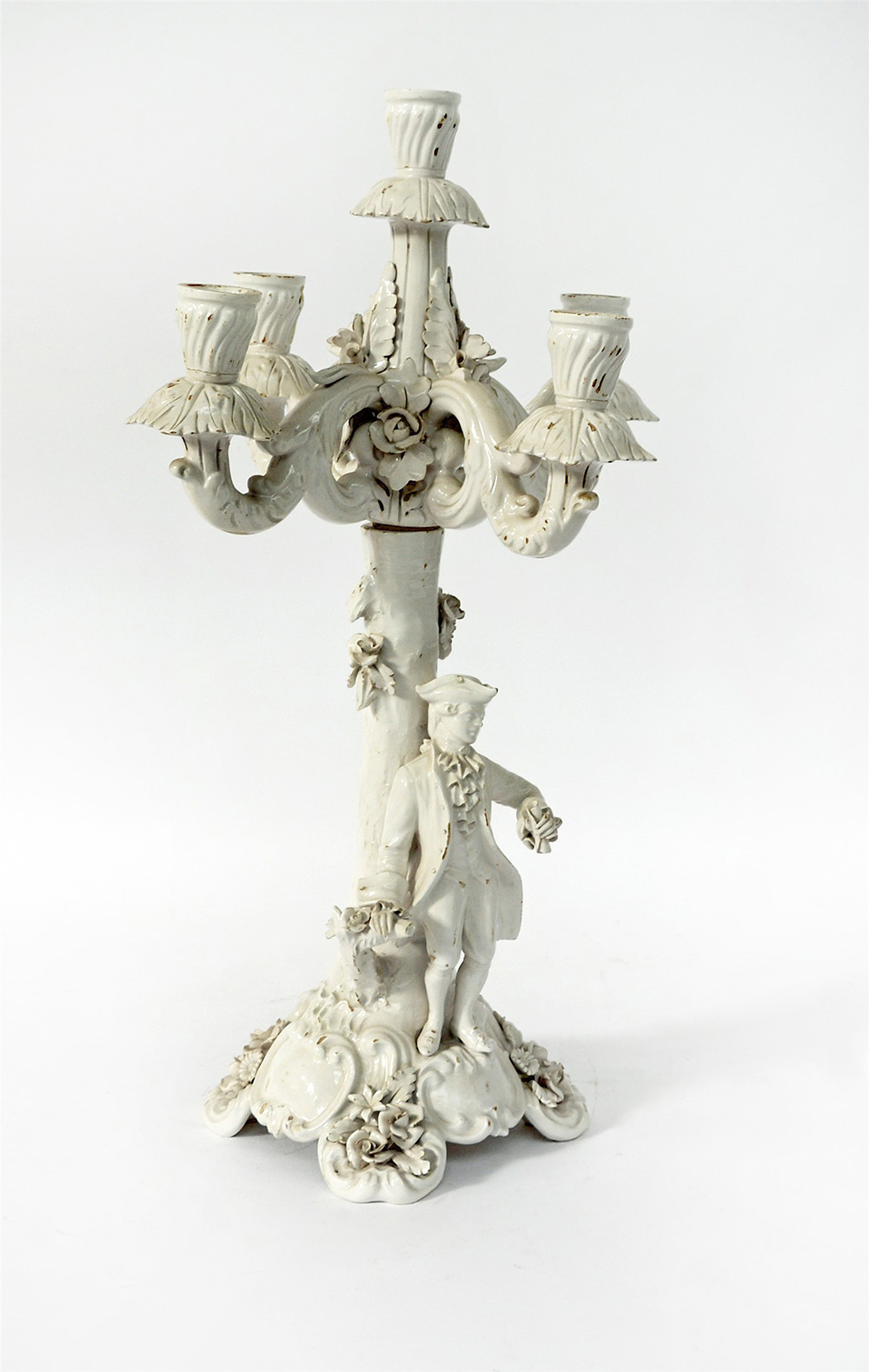 Manifattura della prima meta del sec. XX. Grande candeliere a cinque fiamme in porcellana bianca con fusto decorato con nobiluomo (h cm 53) (difetti)