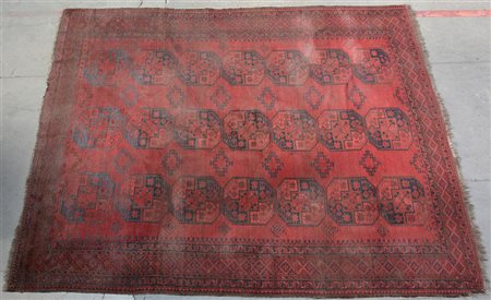 [Tappeti] Tappeto Afghan, Turkestan occidentale, inizio secolo XX. Disegno a ""zampa di elefante"" su fondo rosso (cm 323x264) (difetti)